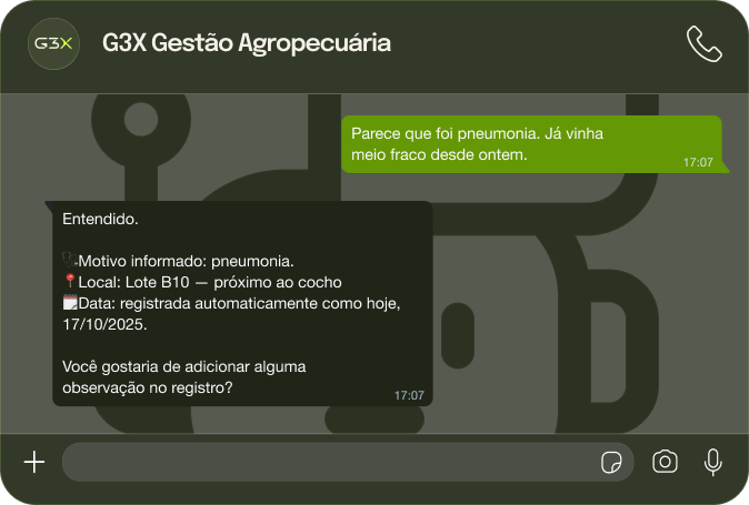 Na G3X Gestão Agropecuária, unimos tradição do agronegócio com tecnologia de ponta. Somos pioneiros no Brasil em automação de controles pecuários com inteligência artificial, transformando dados em decisões estratégicas para o crescimento da sua fazenda.